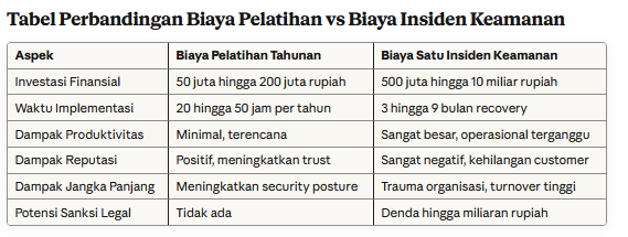 Banyak perusahaan masih melihat pelatihan keamanan siber sebagai cost center padahal sebenarnya ini investasi yang menghasilkan ROI signifikan. Mari kita lihat angka-angkanya.