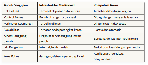 Meskipun prinsip dasarnya sama, uji penetrasi infrastruktur peladen tradisional dan lingkungan komputasi awan memiliki perbedaan signifikan yang perlu dipahami.