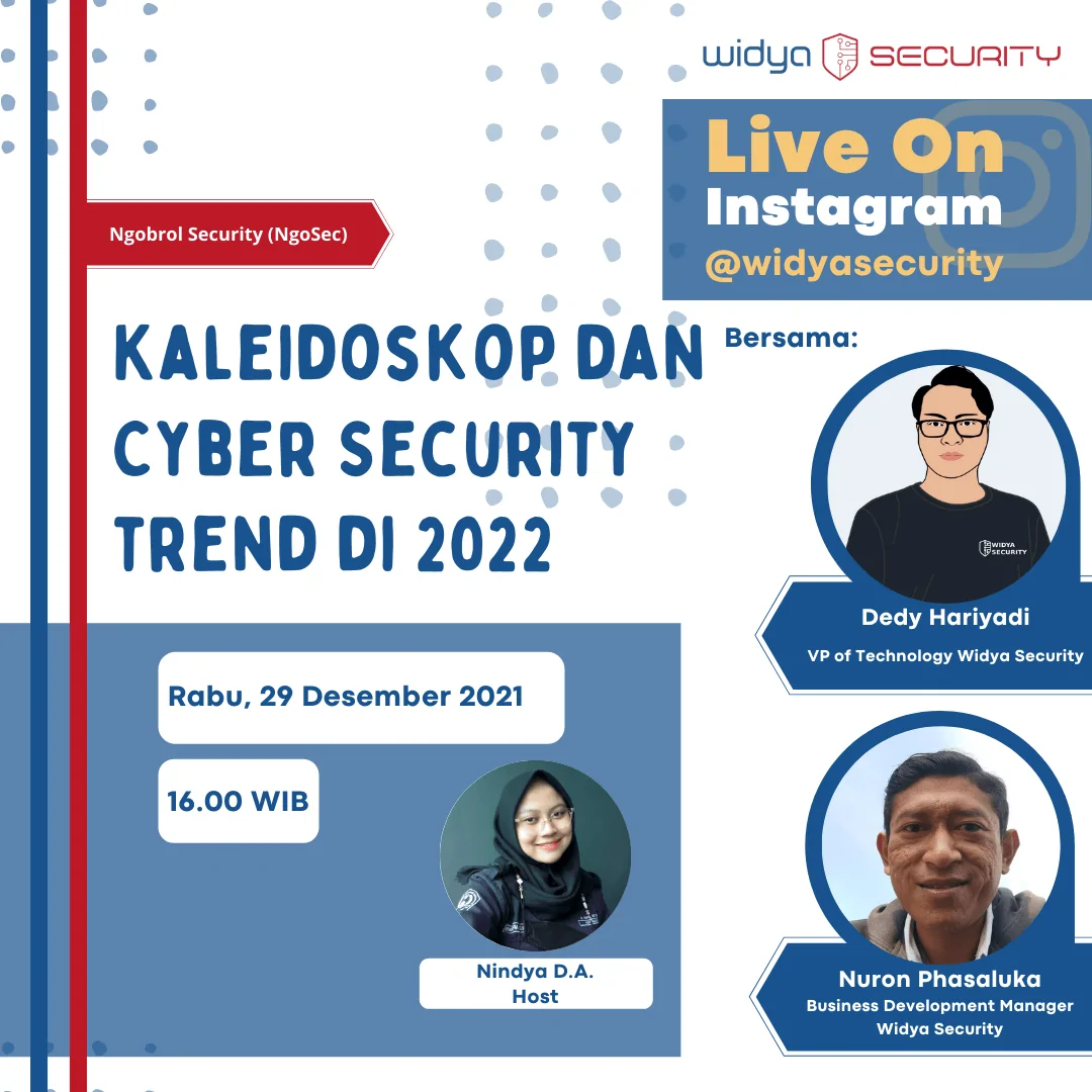 Host : Nindy Pembicara : Dedy Hariyadi (VP of Technology at Widya Security) & Nuron Phasaluka (Business Development Manager at Widya Security) Rabu, 29 Desember 2021